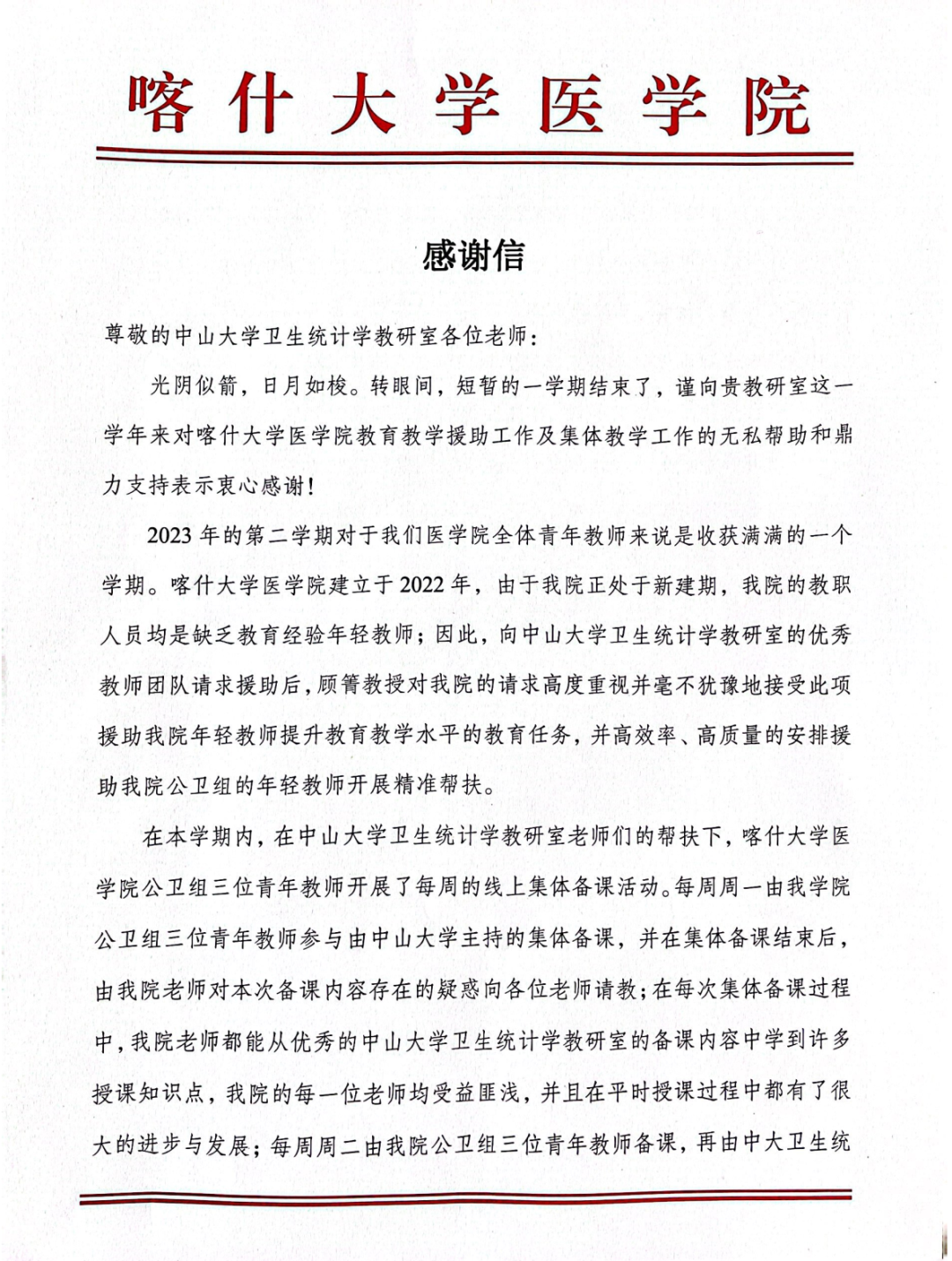 @医学统计学教研室,喀什大学医学院寄来了一封信