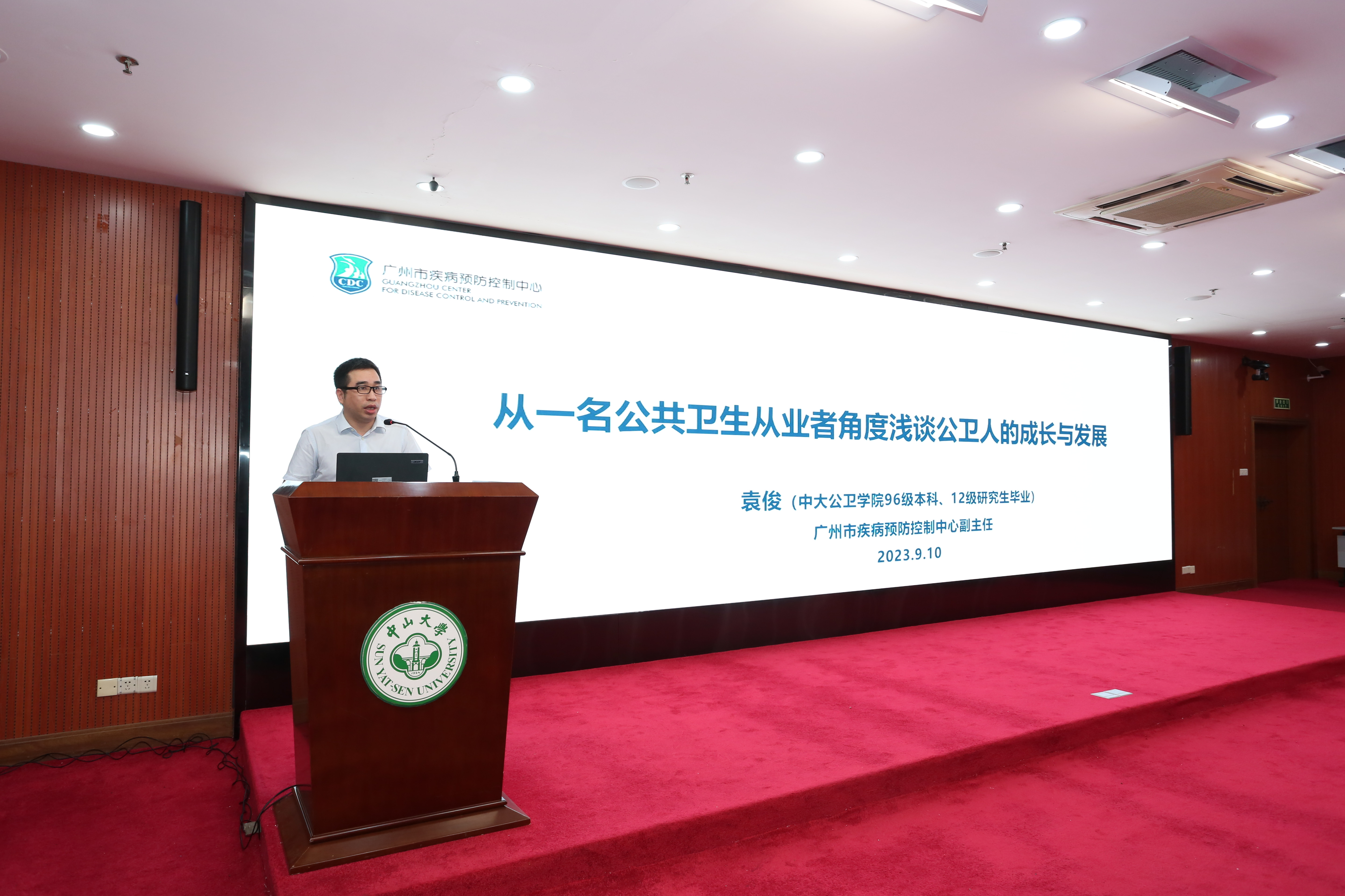 袁俊校友以《从一名公共卫生从业者角度浅谈公卫人的成长与发展》为题为新生们讲授“校友第一课”。他与大家分享了自身在中大公卫的求学历程和22年在工作中成长之路,这让同学们对公共卫生的内核、公卫人的使命有了更加深刻的理解。一名优秀的公卫人要立公卫之志,炼公卫之技,怀公卫之情,努力践行公卫使命,全身心投入到公共卫生事业中去。最后,袁俊校友勉励新生们坚守专业信仰与理想,勤学善思,以积极乐观的心态开启新征程、迎接新挑战。