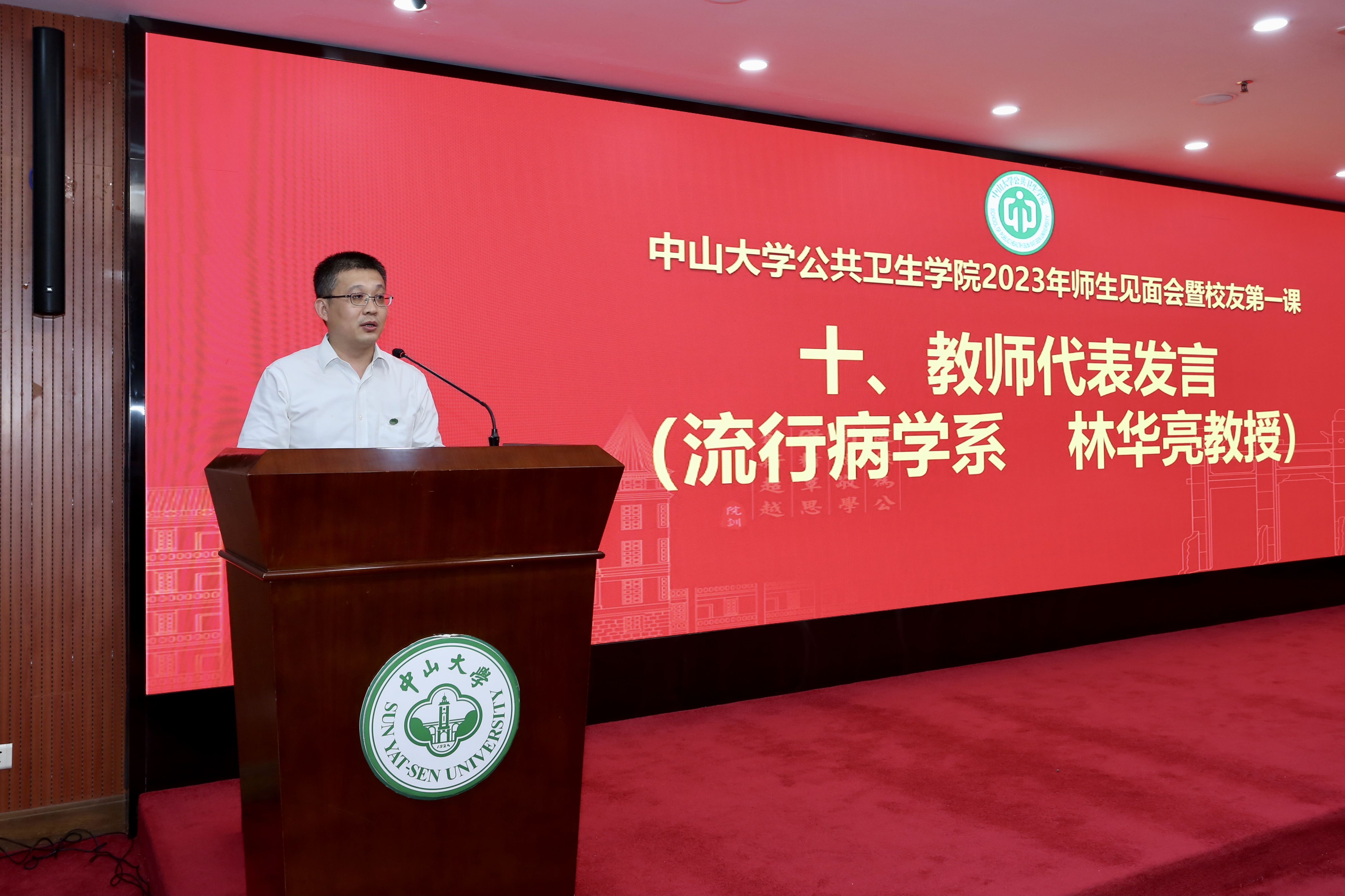 谆谆师语,切切关怀。流行病学系主任林华亮教授作为教师代表发言。林教授就如何成为一名出色的公卫人提出建议。他表示,身为新时代的公卫人,同学们要与党同心,要有奉献国家、奉献社会的责任感,要坚持人民至上,生命至上,树立为公共卫生事业做出贡献的远大理想,并为之制定切实可行的长远目标。林教授寄语,希望同学们勤于思考、开拓创新、乐观向上、实干担当,不负时代,不负人民,建功立业,绽放青春。