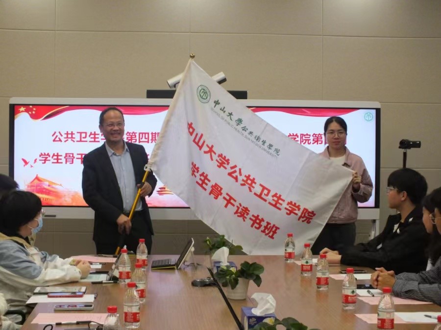 随后,学院党委范瑞泉书记为公共卫生学院第四期学生骨干读书班授班旗,读书班班长张靖瑜同学代表读书班接旗。