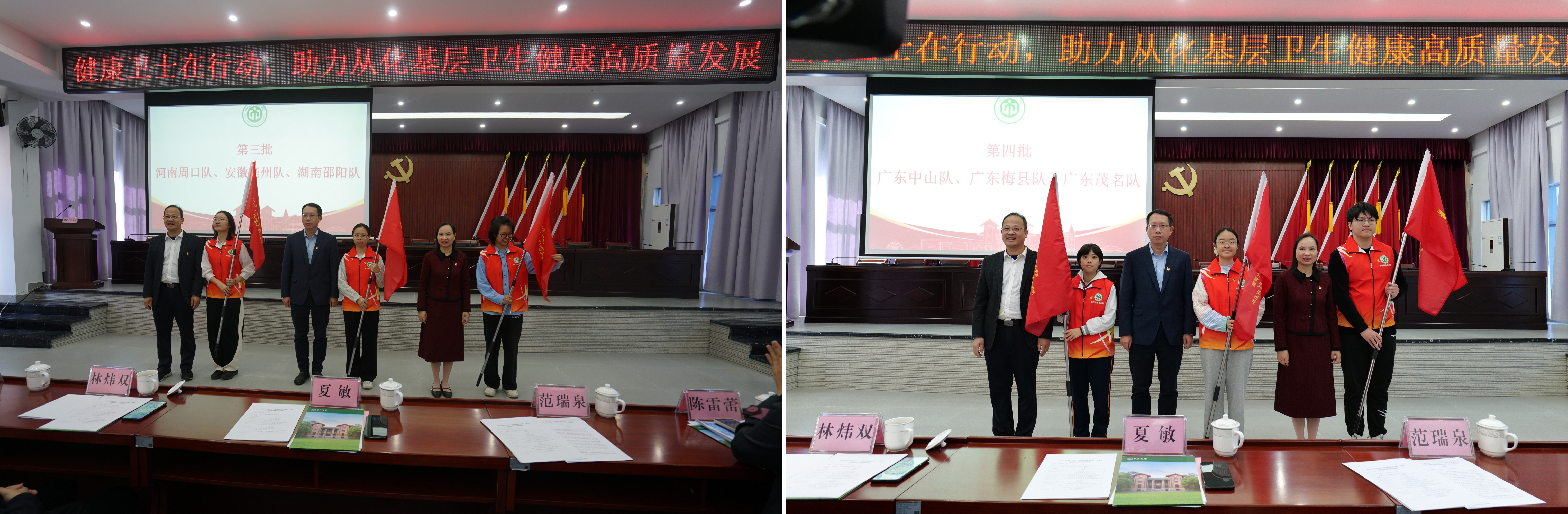 接下来,参会领导嘉宾为各突击队授旗。据介绍,今年寒假公共卫生学院共派出15支队伍奔赴12个城市开展“我在家乡做科普”广东省百千万工程突击队寒假社会实践活动,足迹将遍布广东省大湾区和粤东西北城镇,还包括西藏拉萨、河南周口、江苏盐城、湖南邵阳等地。中大公卫学子将继续带着专业知识和满腔热情奔赴各地,用实际行动践行“预防为主”的理念,传递健康知识,倡导健康生活方式,为我国的卫生与健康事业、为“百县千镇万村”高质量发展贡献青春力量。