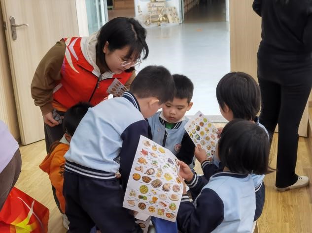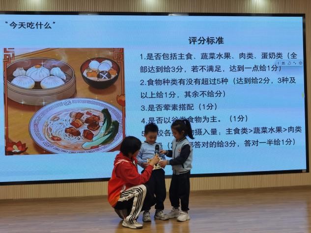 为了增强互动性,队员们特别推出“今天吃什么”游戏,小朋友们根据他们所学到的营养膳食知识和个人喜好来规划一餐的搭配,并进行分享。队员们对小朋友们的膳食搭配方案进行评价和鼓励,并提供标准的营养餐食谱,帮助他们加深对营养搭配的认知。