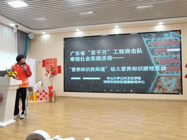 yl88858永利集团公共卫生学院广东省百千万工程深圳宝安突击队由学院团委书记陈霞老师带队,队员由公共卫生学院2020级2班的玉相约、吴静敏、林仪、廖予艺、李雪瑜、陈晓璇等6位同学组成。突击队以“健康知识入我心”为主题,于1月16日-17日,在广东省深圳市宝安区开展健康卫士在行动健康科普活动,活动分为两个部分:一是“营养膳食社区行”,在社区进行营养膳食主题社区游园会,组织“营养素对对碰”“套圈圈”等小游戏,在游戏中科普营养知识;二是“营养知识我知道”,面向幼儿园的小朋友开展幼儿营养知识科普小课堂,传播健康膳食的理念。公卫学子们深入社区和幼儿园,通过科普活动向公众传递健康知识,提升老年人和小朋友的健康素养水平,感受专业服务的魅力。