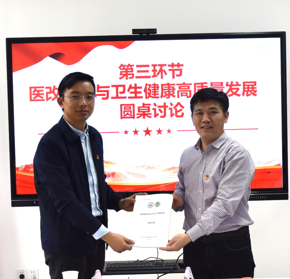 活动环节之三,赠送课程思政汇编资料,圆桌研讨百年党史之公共卫生。黄奕祥教授介绍了中大公共卫生学院党委中青年骨干读书班的办班情况,并向马聪副处长一行赠送了公共卫生学院中青年骨干读书班(第一期)编写的学习教育资料——《百年党史中的公共卫生与课程思政资料汇编》(简称为《汇编》)。第一期中青班学员卫生管理学系杨廉平副教授介绍了《汇编》的编写过程,学习资料搜集和撰写相关体会,分享并与大家研讨了《汇编》资料中我党百年辉煌历史的公共卫生案例,与会代表从公共卫生文化的角度深入理解了我党为什么能够不断赢得战争、带领人民从一个胜利走向另一个胜利的缘由。