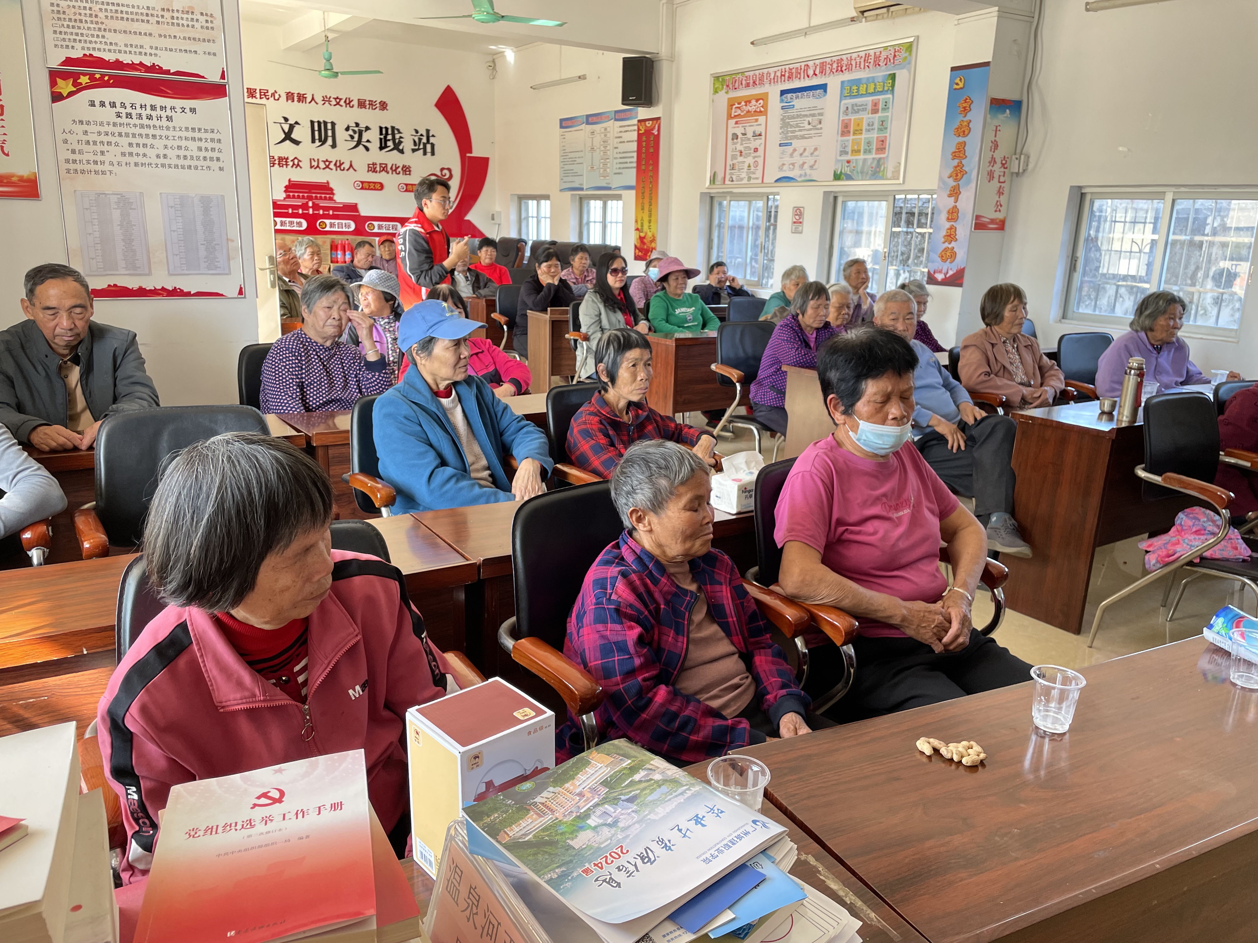 在老年人心理健康知识讲座中,突击队队员带领村民们进行了五分钟的粤语引导冥想,村民们积极配合,并表示冥想有助于保持内心的安定和情绪的平和。