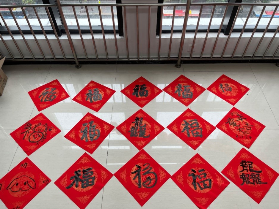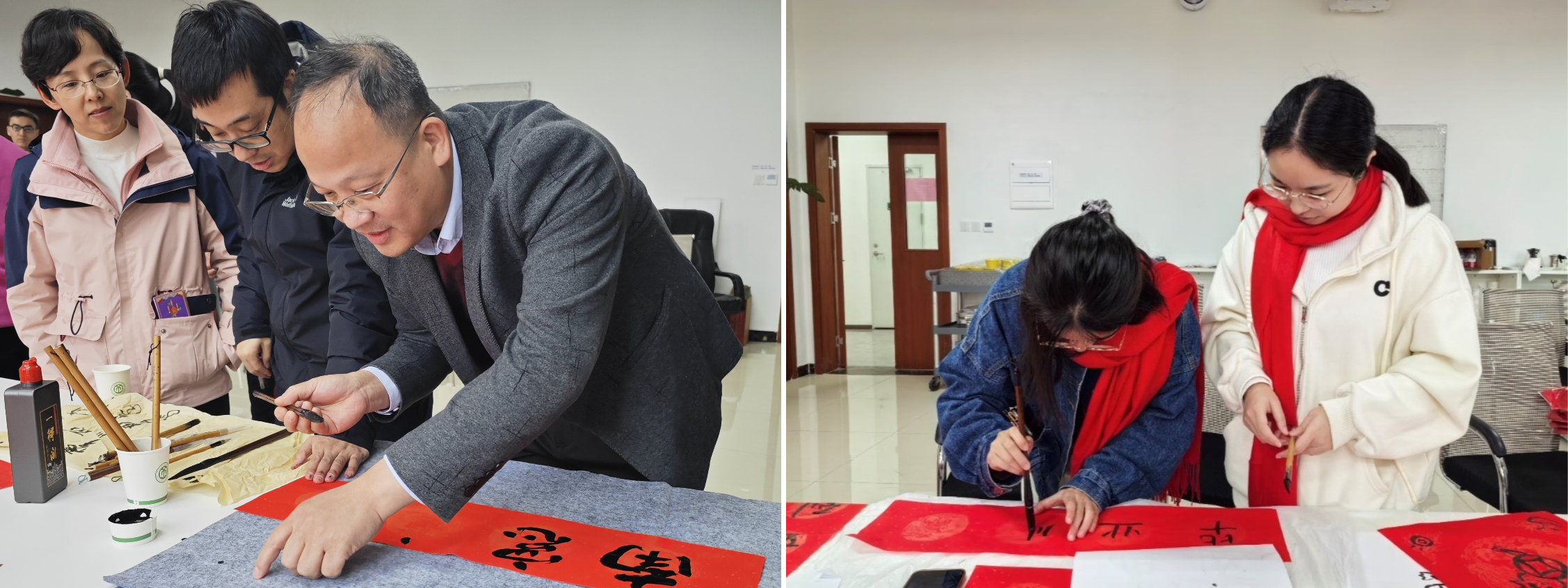 首先是书法自由创作环节,同学们兴致勃勃、跃跃欲试。或写下新年祝福,或自勉学术进步。有同学现场写下“披星戴月不足惧,一心只想收数据”的对联,师生纷纷被其“与其坐等数据从天降,不如亲赴现场控质量“的科研热情与学术态度所感染。特邀嘉宾杨博逸老师凝神聚气、挥毫泼墨,让众人领略了隶书、行书等不同书体的传统书法之美。多名老师同学也喜获杨博逸副教授的精美题联,活动现场一时间墨香四溢。