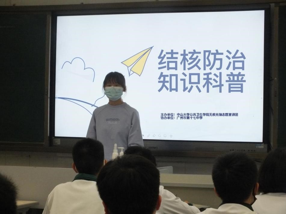 宣讲团于5月20日前往广州市新港中路小学开展“入小学结核防治健康科普”宣讲活动;于21日前往广州市第十七中学开展“入中学结核防治健康科普”宣讲活动。前者共分为三个部分:互动调查、系统认知、游戏互动;后者分为四个部分:科学认知篇、个人防护篇、科学康复篇、知识竞赛,也穿插了科普知识问答的互动环节。既“有意义”又“有意思”,把防治结核的种子播入中小学学生的心田,不断提升全民科学素质。