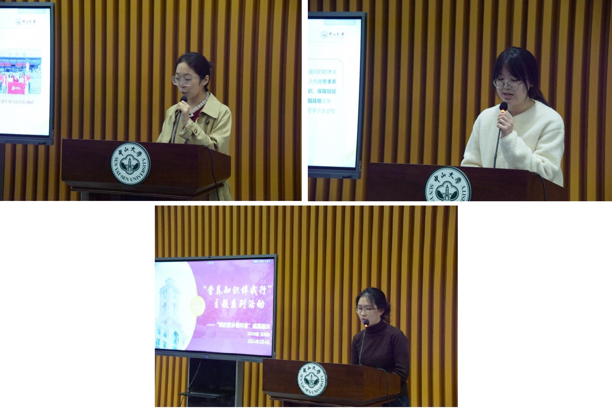 获得一等奖的3支队伍依次进行项目成果展示。江门恩平队通过校地结对深入基层、走访调研,以“乐膳好食”营养膳食游园会、义诊、慢性病防控知识宣讲等多样化的形式开展科普活动,在恩平市人民医院建立“健康卫士工作站”并启动“提升恩平市基层医疗卫生机构医疗技术水平”项目。广州从化队将服务点设于温泉镇,重点关注老年人健康,通过开展健康科普讲座提高当地村民对慢病管理、营养膳食和心理健康的认识,增强村民对于冬季养生的自我保健意识。深圳宝安队重点关注儿童健康,在当地社区组织开展营养膳食游园会和幼儿园营养卫生健康知识小课堂,寓教于乐,以有趣的游戏吸引群众参与学习营养知识。
