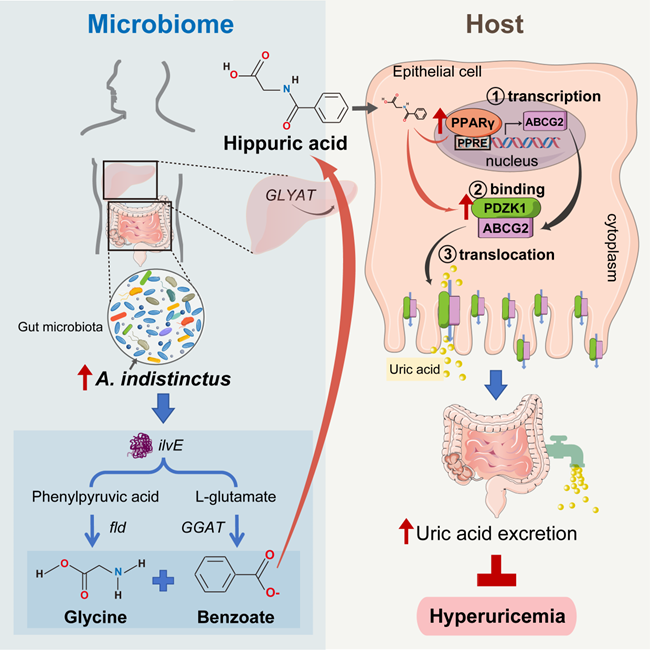 近日,公共卫生学院柳雁课题组在Cell Host & Microbe期刊(中科院1区TOP,IF=30.3)发表了题为“Alistipes indistinctus-derived hippuric acid promotes intestinal urate excretion to alleviate hyperuricemia”的研究论文。该研究首次揭示了肠道共生菌A. indistinctus通过激活肠道尿酸转运受体ATP结合盒G亚家族成员2(ATP binding cassette subfamily G member 2, ABCG2),促进肠道尿酸盐排泄降低高尿酸血症风险的作用机制,为高尿酸血症早期防治提供了新思路。