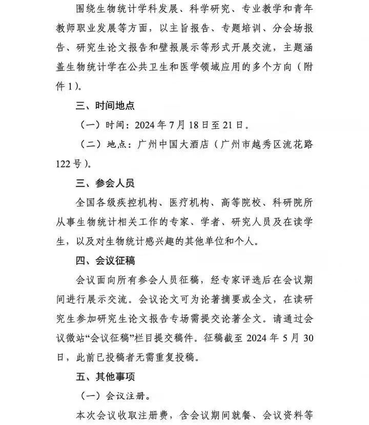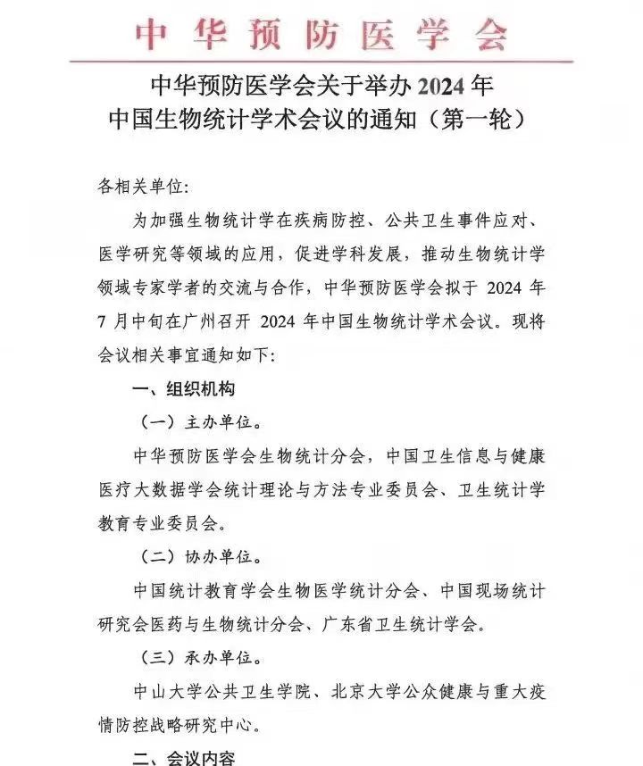 中华预防医学会关于举办2024年中国生物统计学术会议的通知(第一轮)