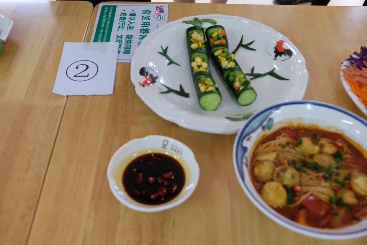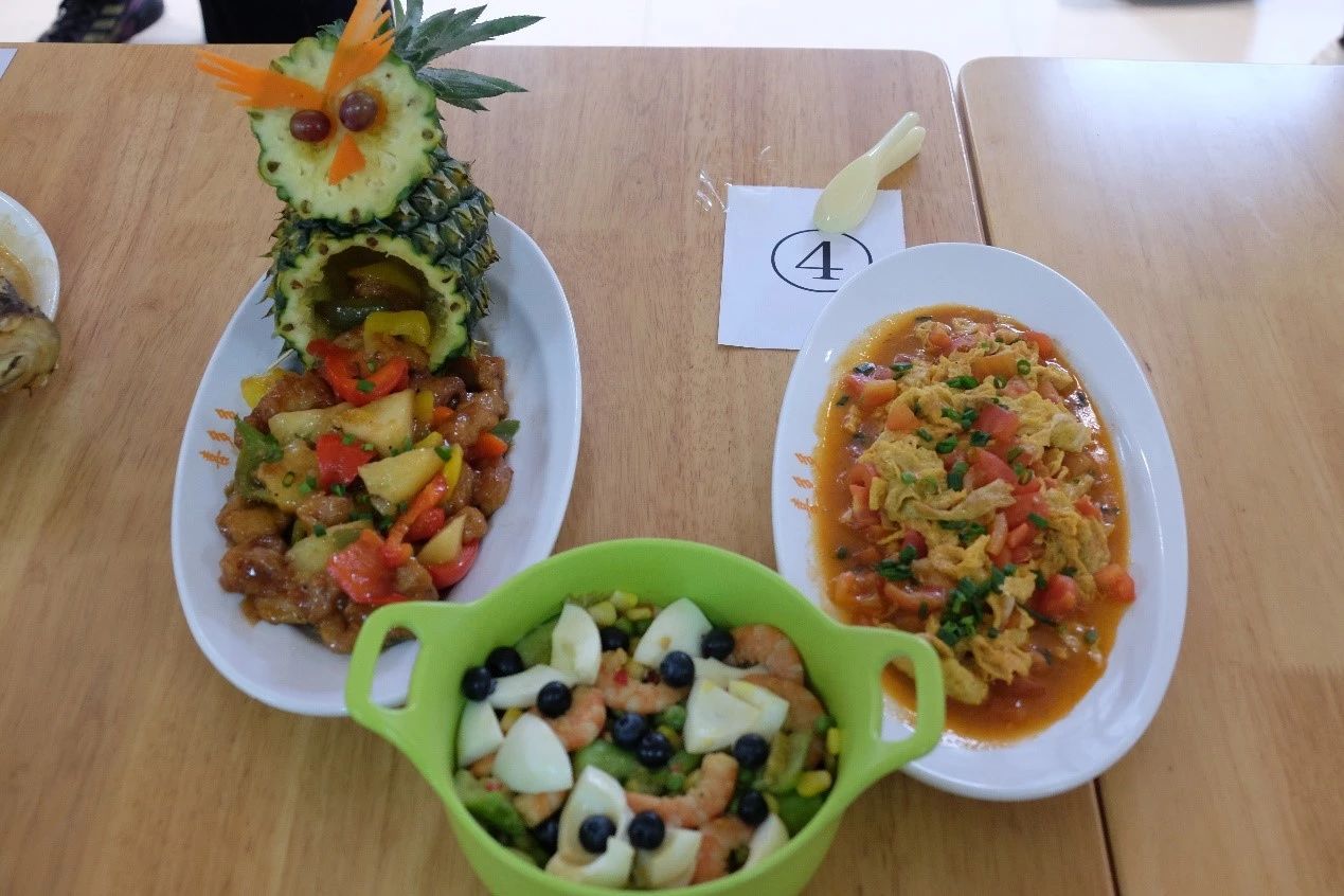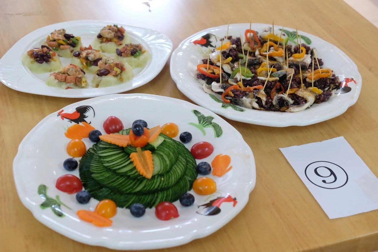 烹饪环节过后,比赛进入美食展示阶段。各队伍依次展示精心烹制的美味佳肴。创新的烹饪手法、精致的装饰摆盘、色香味全面俱佳的菜品,无一不让在场的每一个人为之心动。寓意美好的“花开富贵”鱼、色彩缤纷的五彩大拉皮、用料丰富的普罗旺斯炖菜、创新营养的杂粮蒸鱼,以及“青龙过海”凉拌青瓜、美味甜点“橙c中式”……无论视觉与味觉,每一道菜诱人垂涎,赢得观众和评委们的高度赞赏。