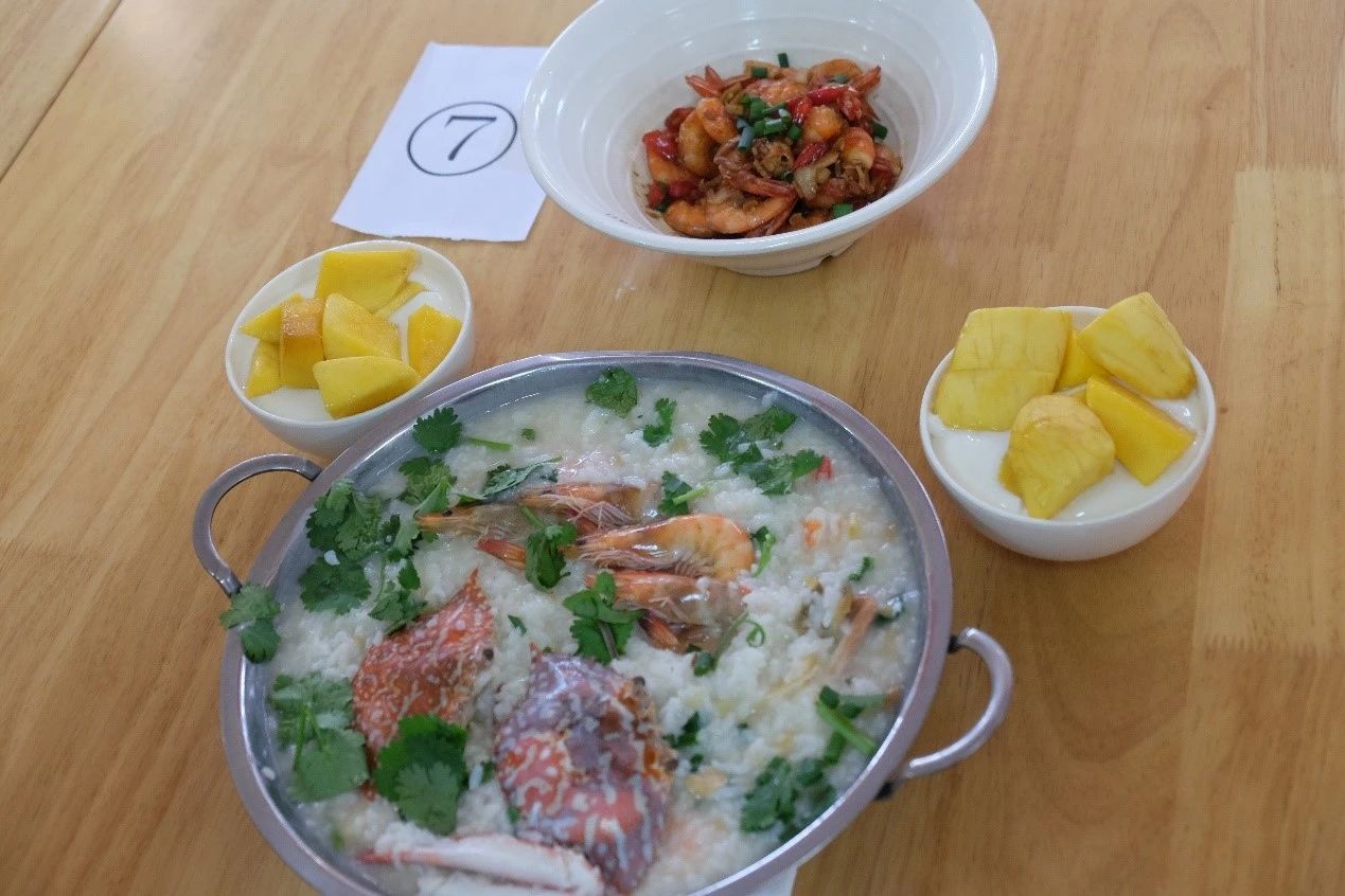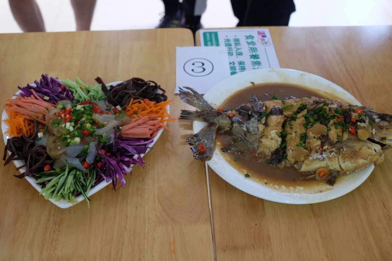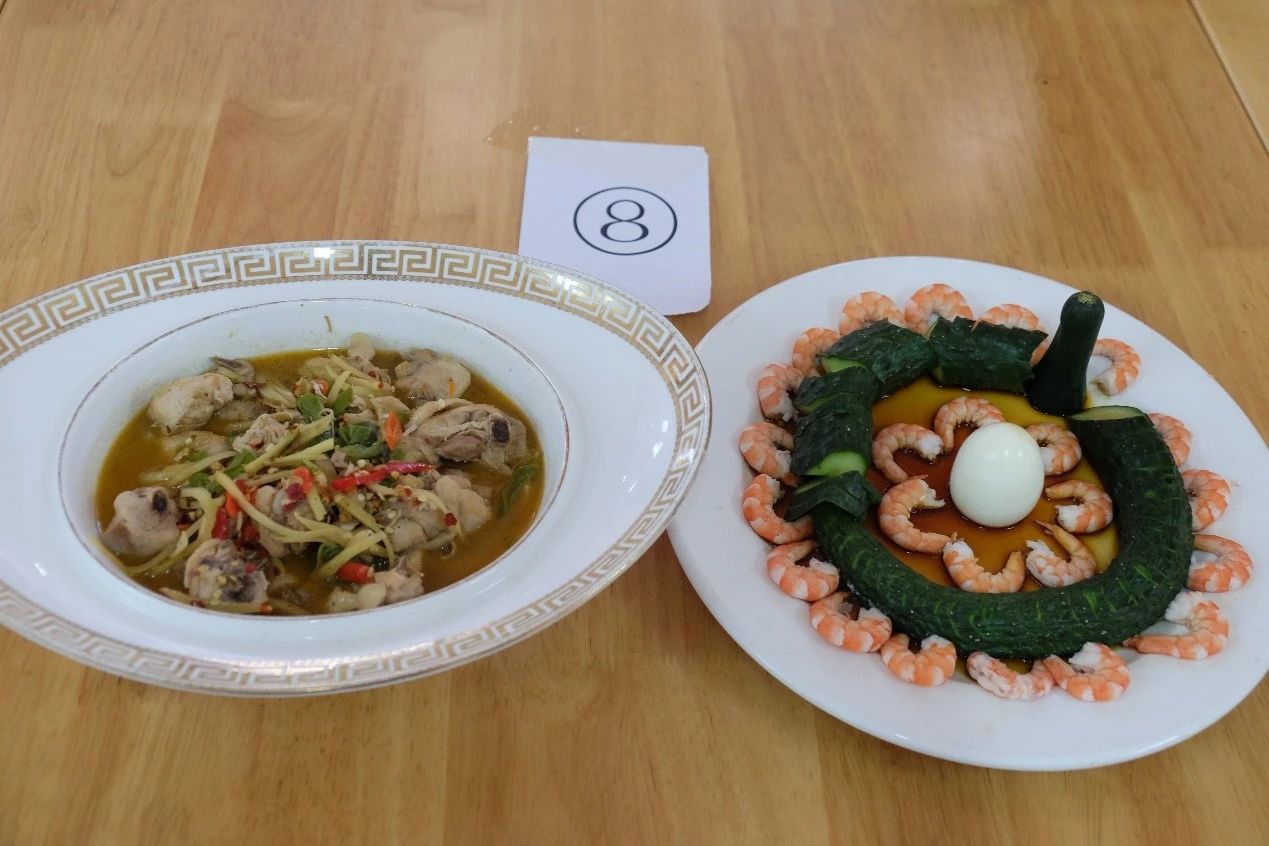 烹饪环节过后,比赛进入美食展示阶段。各队伍依次展示精心烹制的美味佳肴。创新的烹饪手法、精致的装饰摆盘、色香味全面俱佳的菜品,无一不让在场的每一个人为之心动。寓意美好的“花开富贵”鱼、色彩缤纷的五彩大拉皮、用料丰富的普罗旺斯炖菜、创新营养的杂粮蒸鱼,以及“青龙过海”凉拌青瓜、美味甜点“橙c中式”……无论视觉与味觉,每一道菜诱人垂涎,赢得观众和评委们的高度赞赏。