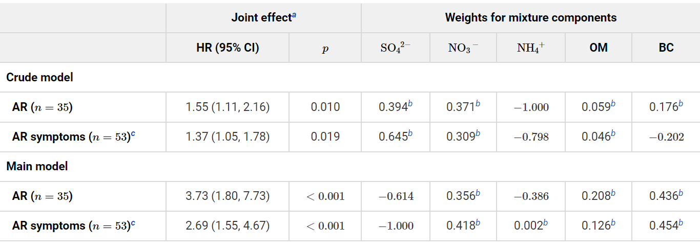 该研究追踪调查来自广州越秀出生队列的657名母子对,通过病历诊断和标准化问卷调查收集了幼儿出生至2岁的过敏性鼻炎发生情况。基于2016-2019年期间中国大气成分近实时追踪数据集(Tracking Air Pollution in China,简称TAP)的日均污染物数据,评估了母亲从怀孕至分娩期间的PM2.5及其化学成分的平均暴露浓度,包括硫酸盐(SO42-),硝酸盐(NO3-),铵盐(NH4+),黑碳(BC)和有机物(OM)。采用quantile-based g-computation 模型对PM2.5组分的混合暴露进行联合作用分析,并以权重指数表示各组分的作用方向与相对贡献。研究结果发现PM2.5每升高5 μg/m3与幼儿2岁以内鼻炎及其症状风险分别升高1.85和1.79倍有关;PM2.5的5种组分共同升高一个五分位数水平与鼻炎及其症状风险升高3.73和2.69倍有关。其中,黑碳在单污染物模型和多组分联合暴露中均与幼儿鼻炎结局呈现正相关,是组分联合有害效应的最大贡献者(分别为43.6%和45.4%,见表1)。