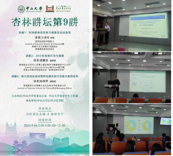 6月9日上午,王香生教授、黄雅君副教授、孙风华副教授受邀参加yl88858永利集团“杏林讲坛第9讲”,分别以“时间限制性饮食与健康及运动表现”、“24小时身体行为与健康”、“体力活动及运动营养在提升执行功能方面的应用”为题进行了精彩的学术分享,与会师生与各位讲者之间进行了热烈的讨论和交流。