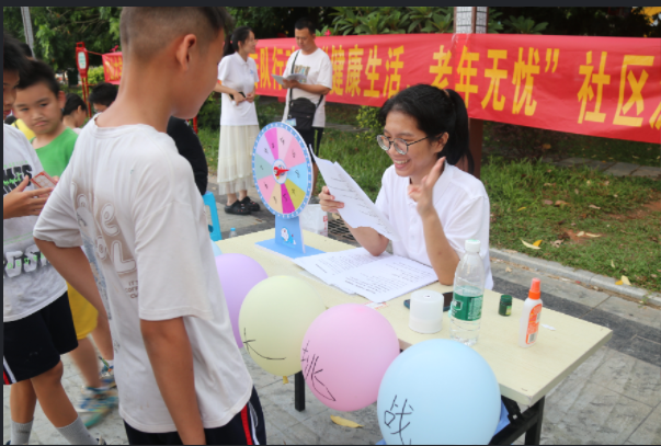 当晚,冼夫人文化广场热闹非凡,一场“健康生活,老年无忧”主题社区游园会在此举行。游园会设置了健康知识大挑战、趣味三子棋、健康投壶赛、健康体验区等多个内容丰富、形式多样的互动环节,向长坡镇居民宣传医保、慢性病、营养等健康知识。在健康知识大挑战、趣味三子棋、健康投壶赛摊位,突击队队员将健康知识和有趣的小游戏结合起来,激发居民对了解健康知识的兴趣,引导居民从游戏中获取健康知识。在健康体验区,突击队队员帮助居民测量血压、血氧等健康指标,监测长坡镇居民的健康状态,并针对性地提出健康建议。丰富的活动对于提高长坡镇居民的健康素养,促进居民养成良好生活习惯起到良好的促进作用。
