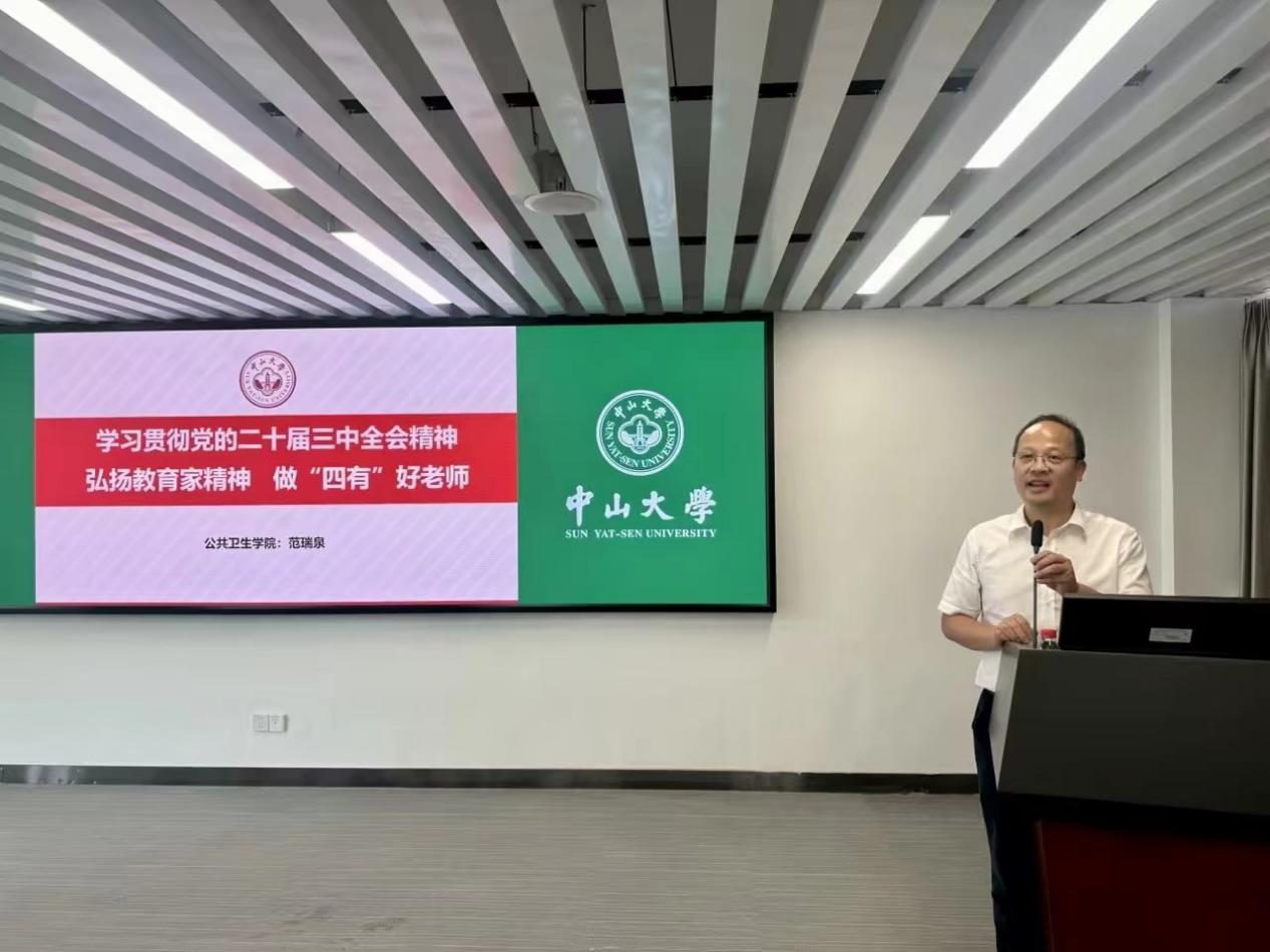 范瑞泉书记与全院教职工一起认真学习党的二十届三中全会精神,希望大家把学习好、宣传好、贯彻好党的二十届三中全会精神与深入推进高水平公共卫生学院建设结合起来,用学习成果指导人才培养、科学研究和社会服务等具体实践。根据《中共中央国务院关于弘扬教育家精神加强新时代高素质专业化教师队伍建设的意见》,范瑞泉书记与教师一起重温教育家精神内涵和“四有”好老师标准。最后向全院教职工进行了师德师风、民族宗教政策的学习教育,希望老师们将《研究生导师指导行为准则》牢记于心,坚持树牢师德师风第一标准。