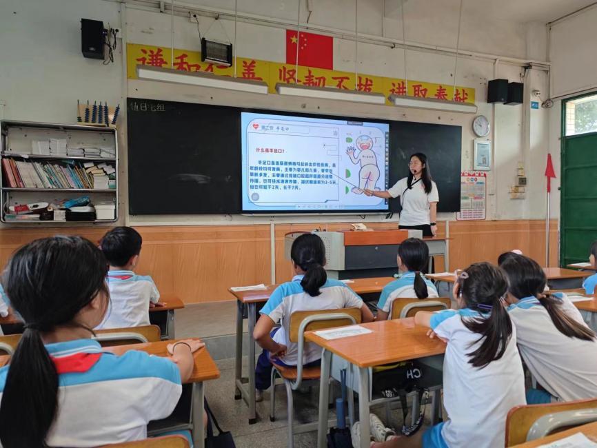 江门新会队莫函则在社区开设科普小课堂,通过12次课向小学生科普常见传染病的预防及治疗方法。群众的笑容让队员们更加笃定作为公卫人健康为公的初心与使命。