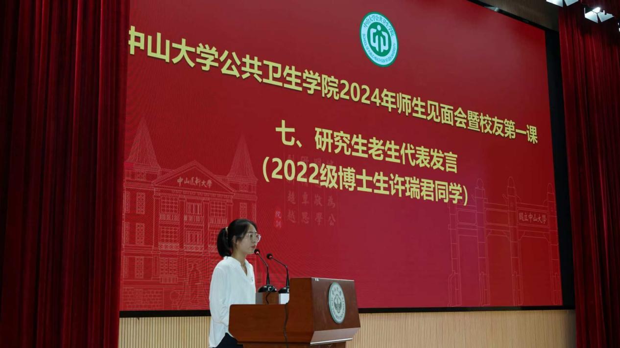 我是2022级流行病与卫生统计学专业的博士研究生许瑞君,很荣幸能够作为研究生老生代表在此发言。首先,请允许我代表公共卫生学院的全体学生向各位领导、老师表示崇高的敬意,向各位朝气蓬勃的新同学们表示热烈的欢迎!