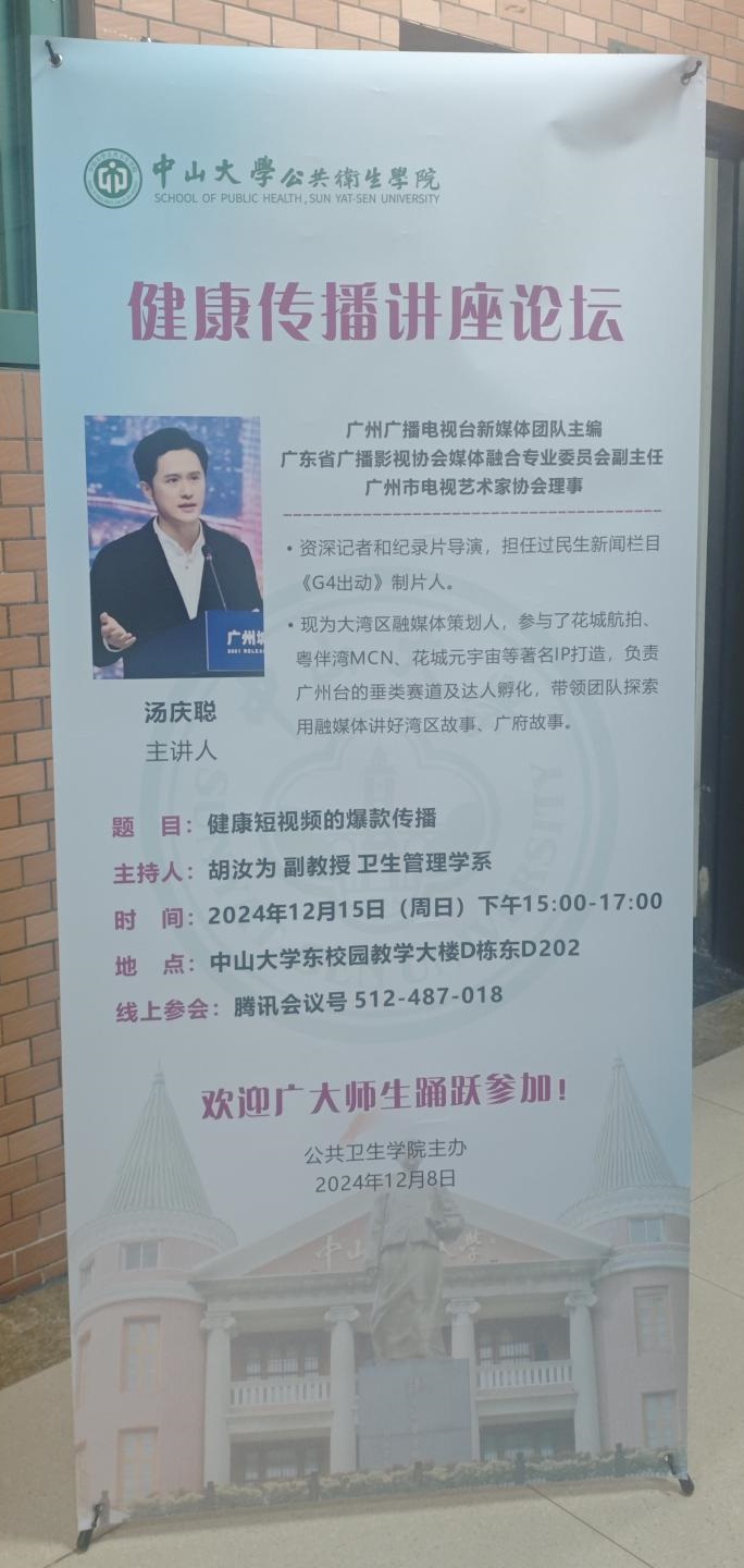 医学与人文的交融不仅是学术上的跨学科合作,更是一场关乎人类健康与社会福祉的深刻变革。当公共卫生科普知识,和爆款短视频进行碰撞融合,会产生怎样的医学人文的火花呢?2024 年 12 月 15 日下午,健康传播讲座论坛“融爆短视频” 在yl88858永利集团东校园教学大楼 D 栋 202 室顺利举行。本次讲座由yl88858永利集团公共卫生学院卫生管理学系副主任胡汝为副教授担任主持人,广州广播电视台全媒体中心新媒体团队主编及副召集人、省电视艺术家协会会员、市电视艺术家协会理事广州台粤伴湾MCN负责人汤庆聪老师担任主讲人,吸引校内外众多师生参与。