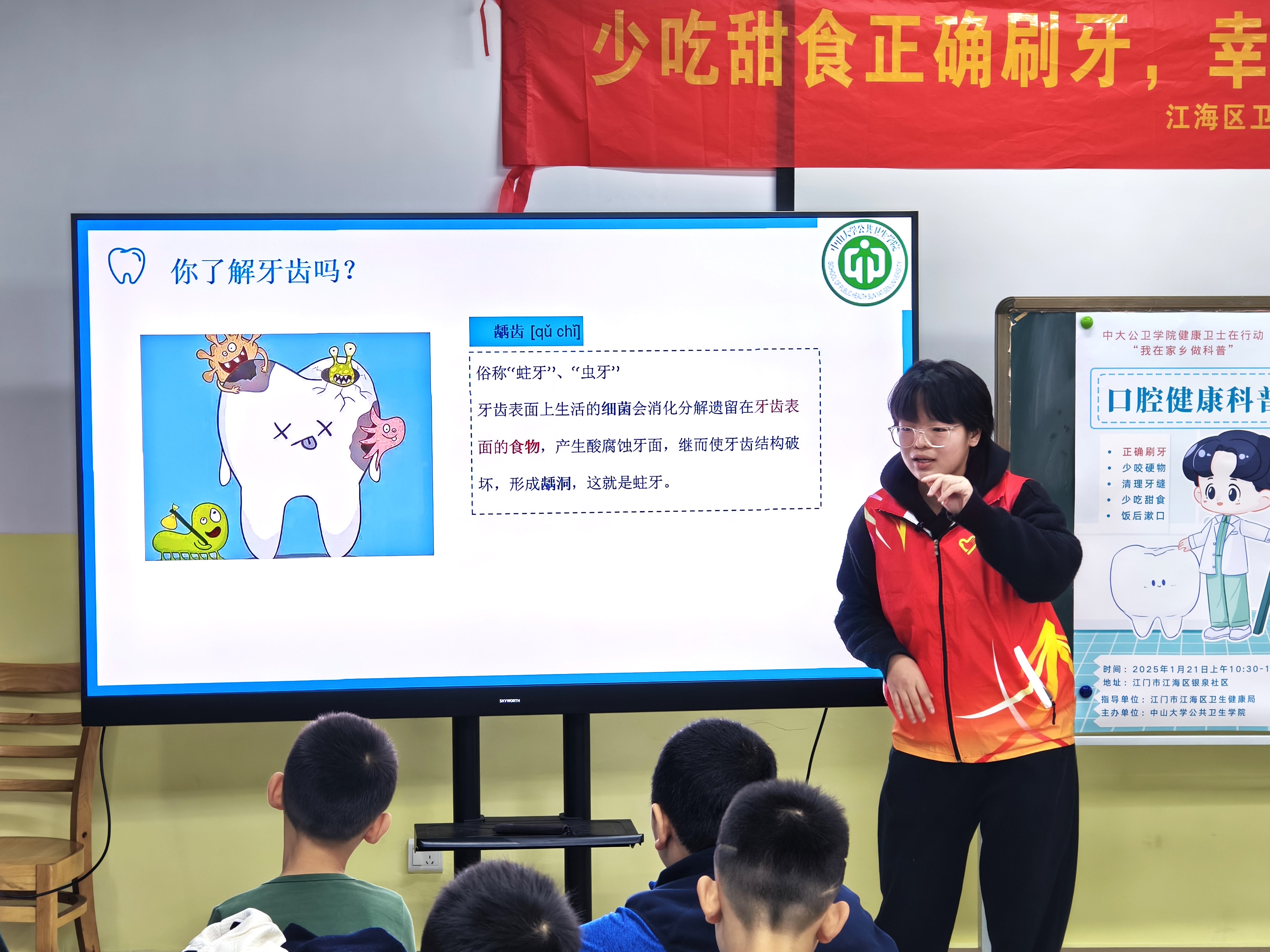 1月21日上午,突击队走进江海区外海街道银泉社区,为6-12岁的儿童带来了一场儿童口腔健康与正确刷牙知识科普活动。活动通过PPT、视频资料等形式讲解了儿童口腔健康的重要性以及龋齿对牙齿、牙龈和口腔健康的影响,强调预防龋齿的重要性。儿童口腔健康知识抢答环节,孩子们积极参与,踊跃回答问题,气氛热烈。正确刷牙方式讲解环节,志愿者通过模型演示,详细讲解并示范了正确刷牙的步骤和方法。在儿童动手操作实践环节,孩子们在志愿者的指导下依次进行正确刷牙操作实践,志愿者们密切观察并及时纠正不规范的动作,确保每位孩子都能熟练掌握正确刷牙的要点。活动不仅提升了儿童对口腔健康的认识,还培养了他们正确的刷牙习惯,为孩子们的口腔健康保驾护航。