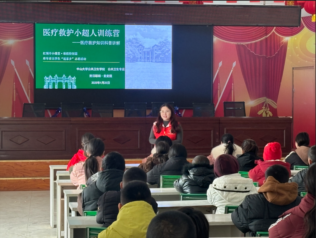 “新疆库车突击队”则在边疆播撒健康火种,努日耶姆·麦麦提同学回到家乡新疆库车市墩阔坦镇荷花村,加入“红领巾小课堂”项目,开展健康科普活动。针对荷花村留守儿童较多的情况,专门增设心理疏导游戏,让孩子们在科普中释放压力、舒缓情绪。课程中,努日耶姆同学坚持“双语教学+文化融合”策略:用维吾尔语讲解急救术语,用库车民歌旋律改编洗手口诀。家长麦麦提明感慨:“孩子回家用普通话教我急救知识,又用维吾尔语给爷爷奶奶科普,真是民族团结的小纽带!”