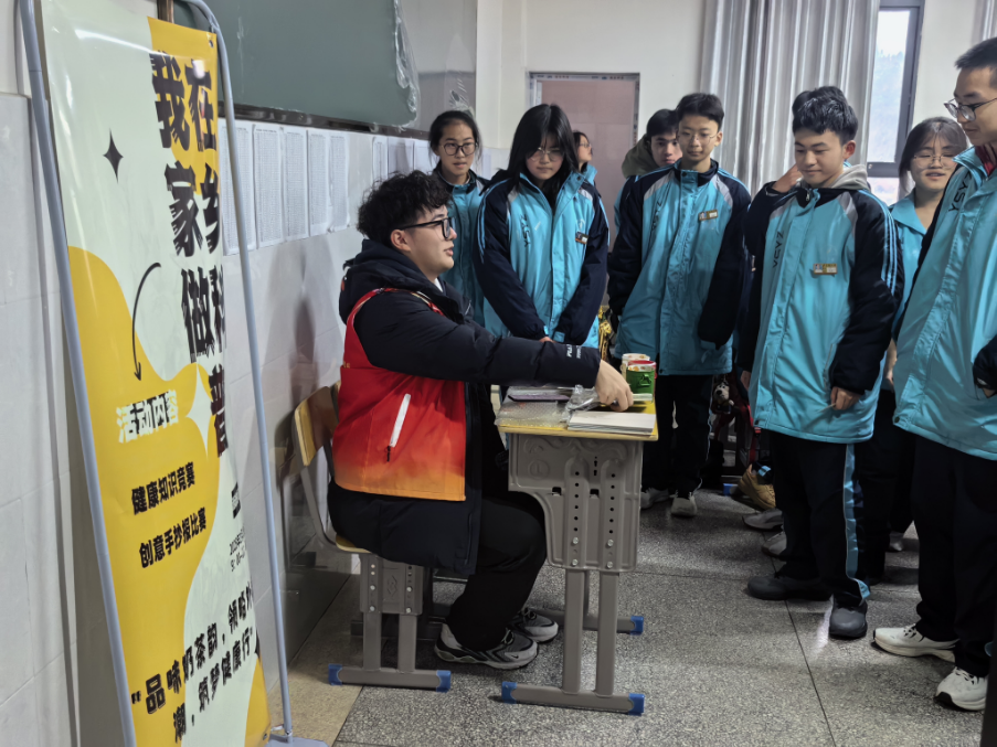 “外卖奶茶”科普队的队员回到母校湖南省永顺县第一中学,开展了以“品味奶茶韵,领略外卖潮,筑梦健康行”为主题的科普活动。他们通过主题班会、知识竞赛、创意手抄报等形式,让高一学生们深入了解奶茶制作流程和健康替代方案,传递健康理念,养成健康生活。2024级本科生周明星说,我们这次的活动以“小知识”撬动“大健康”,在有限的资源和时间下,成功地将健康饮食的理念植入学生心中,是一次很宝贵的成长经历。