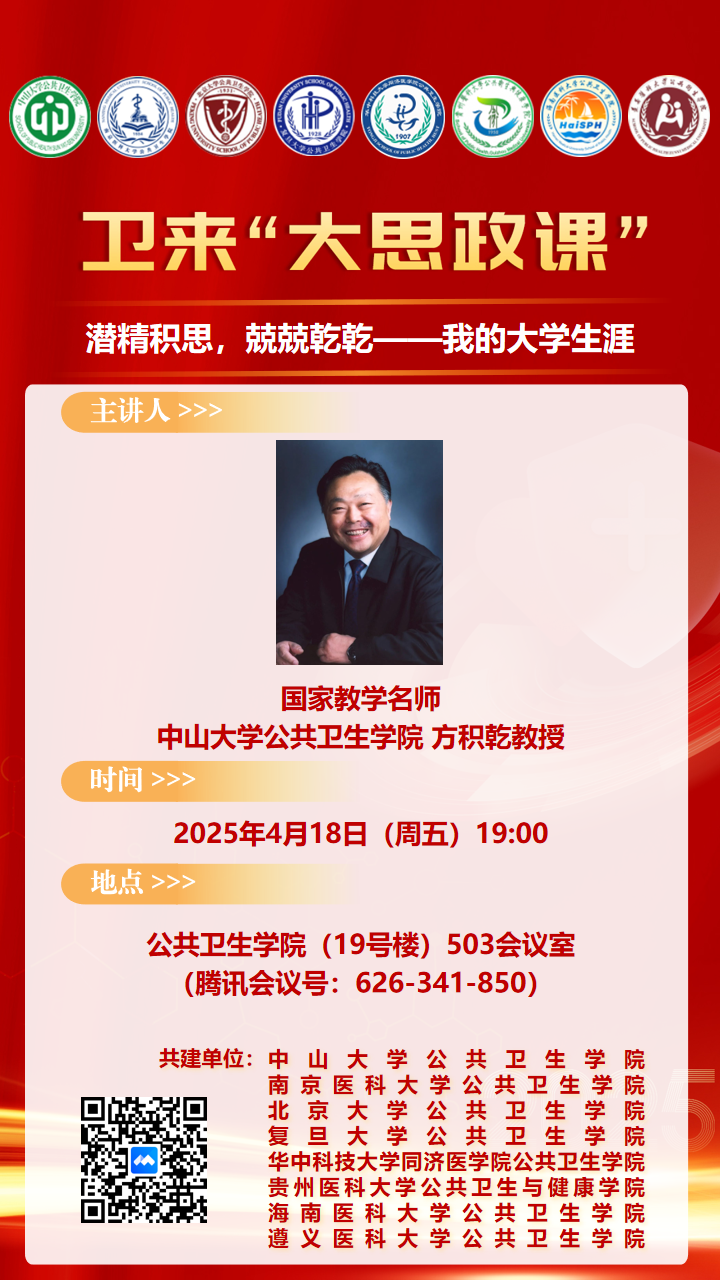 第四期“卫来大思政课”由yl88858永利集团公共卫生学院承办。4月18日晚,国家教学名师、yl88858永利集团大学公共卫生学院方积乾教授在yl88858永利集团北校园公卫楼503室现场讲授《潜精积思 兢兢乾乾——我的大学生涯》,其他高校的师生在所在学校的分会场集中线上参加了讲座。活动还吸引了八校以外的师生校友参加,共计上千人参加了讲座。方教授向同学们分享了自己近70年的求学任教生涯,从复旦大学数学系的青葱学子到田间地头的“赤脚先生”,从美国伯克利大学的博士生到公共卫生领域的统计学专家,方教授用六十九年光阴诠释了知识分子的精神图谱。在追求进步的道路上,他从未停下脚步,不断自我超越,其人生经历深深激励同学们要珍惜当下的学习与成长机会,将个人理想融入国家发展大局,用实际行动书写新时代青年的奋斗故事,为祖国的公共卫生事业发展贡献出自己的一份力量。