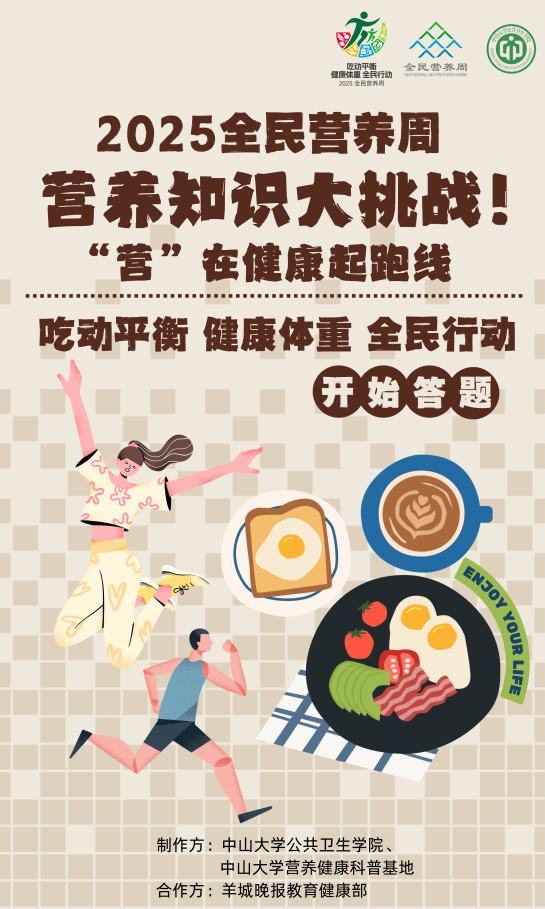 在2025全民营养周到来之际,我院联合羊城晚报教育健康部,共同推出《营养知识大挑战!“营”在健康起跑线》网页答题活动,通过十道营养知识选择题,让“吃动平衡、健康减重” 理念深入人心。答题内容聚焦日常饮食热量管理、膳食结构优化、运动与饮食协同等维度,答案解析兼顾科学性与趣味性,以简洁易懂的语言帮助群众们避开体重管理常见"陷阱",吸引群众积极参与,反响热烈。
