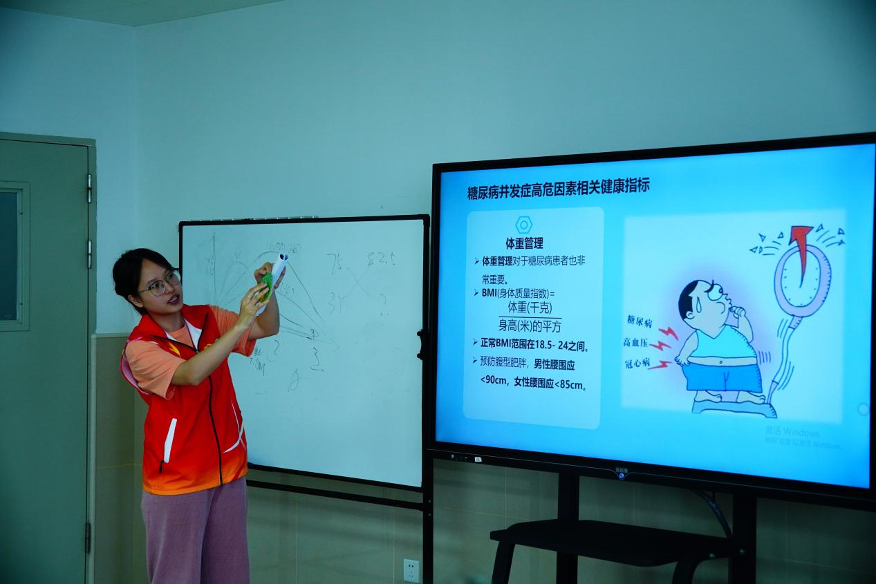 王钰同学在讲座中,用易懂语言讲解糖尿病类型、病因、临床表现,以及血糖、血压、血脂的理想范围。她还指导如何阅读食物标签、理解升糖指数,并推荐适合老年人的饮食和运动方式。活动通过互动环节和个性化建议,帮助老年患者掌握控糖技巧,增强健康行为改变信心,推动健康老龄化。