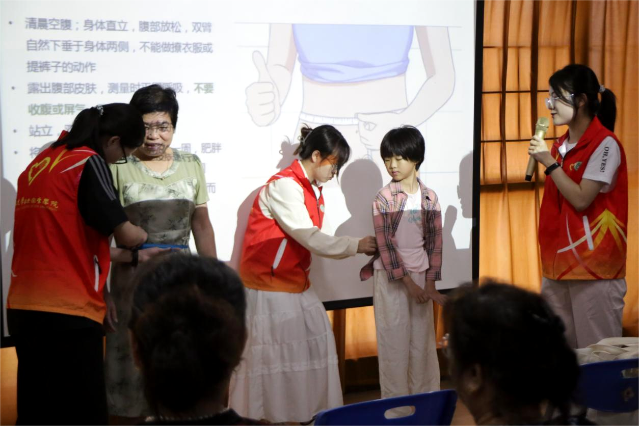 侯思涵同学在讲座中向中老年居民讲解了健康体重标准、测量方法及超重肥胖与慢性病的关系,并教授了合理饮食结构、食品标签识别和适合中老年的居家运动。互动体验区和健康咨询区通过游戏和健康测量,让居民在娱乐中学习健康知识,强化健康理念。