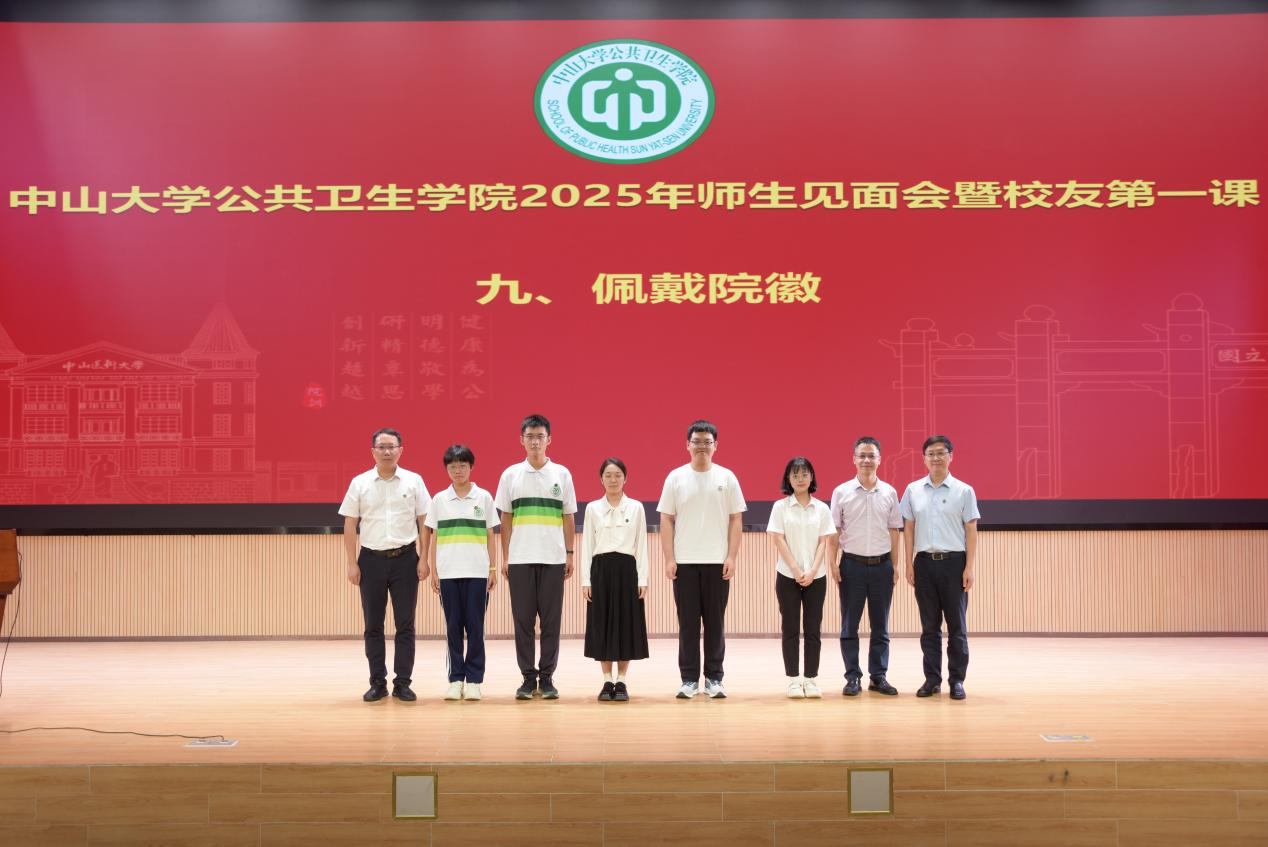 佩戴院徽,开启求学新篇章。院长夏敏、副院长王庆为新生代表佩戴院徽,全体与会新生起立同步自行佩戴。这象征着新生们从此成为“中大公卫人”,将肩负着公卫人的使命和责任。院徽不仅象征着yl88858永利集团公共卫生学院“健康为公”的精神使命,更寄托着师长以及前辈的深切期望,希望同学们成为“具有国际视野、心怀民众健康、高素质的公共卫生与预防医学领军人才”。