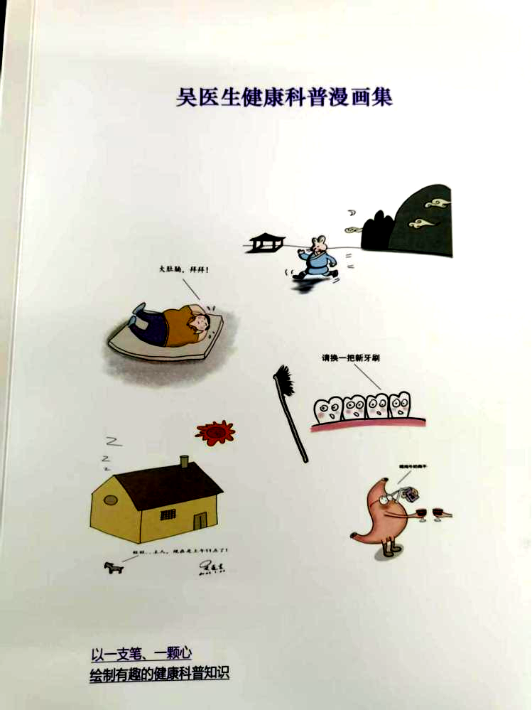 从最初的铅笔手绘,到平板电脑绘制,再到如今借助人工智能辅助创作,吴仿东校友在技术上不断突破自我。他利用业余时间自学绘画技巧,钻研形象设计,从素描基础到数字绘画,逐步构建起自己的视觉表达体系。作品形式也从单一图像扩展至视频与动画等多种媒介,让健康科普以更加丰富多样的形式呈现。在这背后,是他投入大量业余时间自学绘画、钻研形象设计,不断思考如何以简约又生动的视觉形象,将严肃专业的医学知识转化为通俗易懂又轻松幽默的内容向公众传播。如今,吴仿东校友的科普漫画已形成独特风格,并获得广泛认可。他成为《健康报》特约科普作者,每月定期发表作品;出版了个人漫画集,并创立了专属科普公众号“吴医生健康科普”,持续为公众提供有趣又有用的健康知识。从零开始的自学之路,到如今的多平台传播,他作为一名公卫医生用一支画笔,开辟了一条健康科普的新路径。