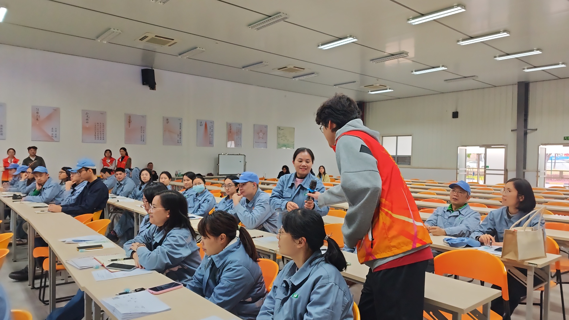 揭牌仪式圆满落幕之后,实践团来到华润怡宝饮料(南宁)有限公司,开展了第一场活动——职业健康科普讲座。期间,黄子龙用通俗的语言解读了噪声“3dB交换律”、中暑表现及防护等专业知识,还贴心为每位工人分发了防护耳塞,一步步拆解佩戴要领,逐一指导纠正,开展手把手教学。卫怡廷则聚焦生产性粉尘防护,实操指导工人正确佩戴防尘口罩,筑牢粉尘防护防线。这场科普活动,把职业健康防护送到一线,让工人听得懂、学得会、用得上,为职场健康筑牢安全屏障,赢得现场一致好评。
